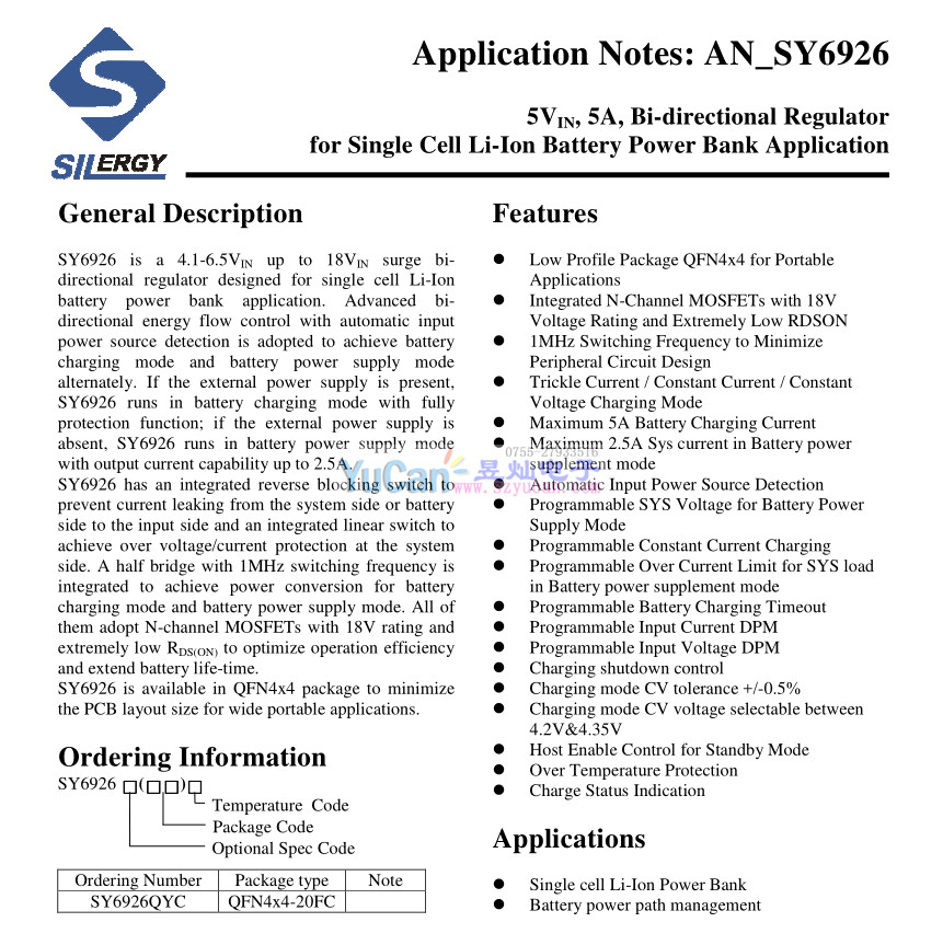 SY6926 內(nèi)置18V耐壓mos適應(yīng)快充電路 充電最大5A 放電2.5A 兼容4.2V 4.35V電池 具輸出限流 EN控制功能 單燈指示的移動(dòng)電源充電寶IC