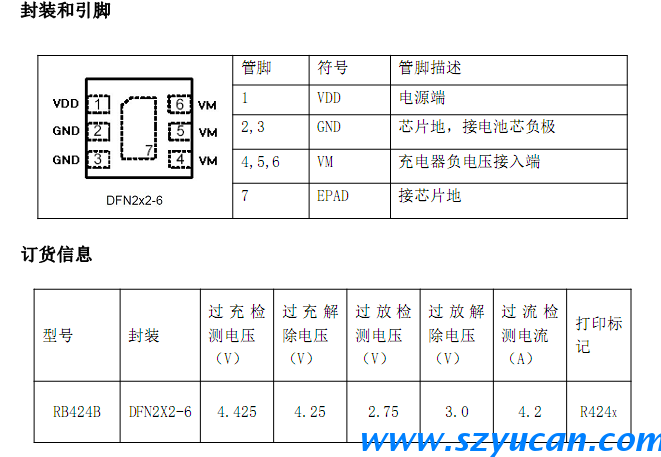 路等各項(xiàng)保護(hù)等功能,確保電芯安全,高效的工作。RB424B采用 DFN2X2-6封裝,外圍只需要一